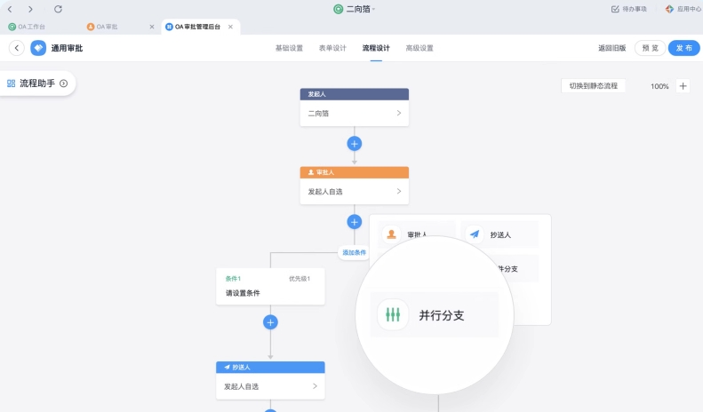 通過(guò)并行節(jié)點(diǎn)、業(yè)務(wù)規(guī)則、動(dòng)態(tài)流程、OCR識(shí)別、單選數(shù)據(jù)聯(lián)動(dòng)、多條件組合等能力支持企業(yè)90%以上的業(yè)務(wù)流程