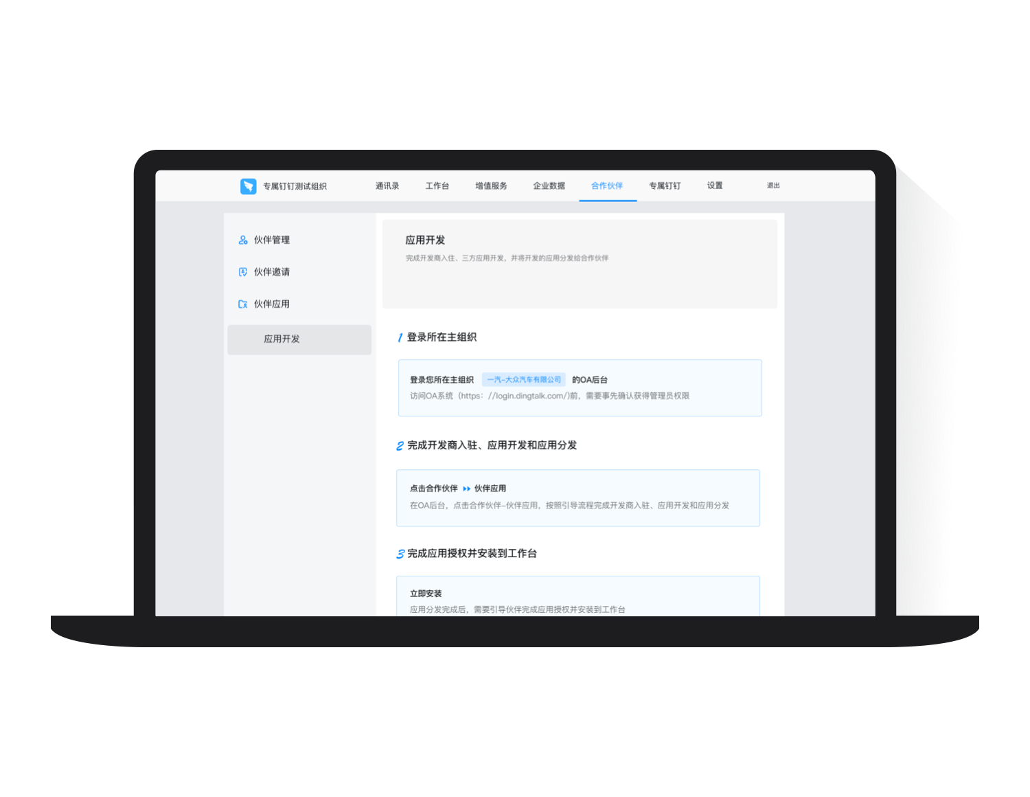 支持主企業開發應用快速分發給合作企業, 無需審批,只需操作一步, 就可完成和伙伴的業務協同。